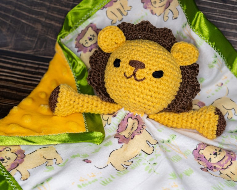 This little Lion lovey is one of the first ones I made. He represents how strong and brave kids can be. I used Lion Brand Feels like Butta for the Yellow and Yarn Bee Baby Soft for the Brown. For the Blanket I sewed together nursery fabric and Minky Fleece and gave it a nice silky edge to finish it off. Little lion is so soft and snuggley your little won't be able to put him down.